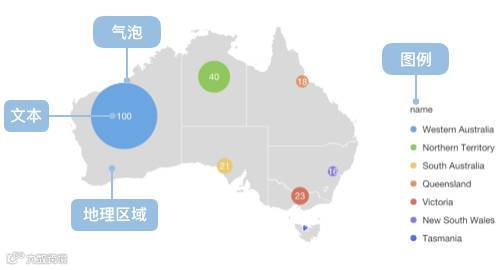 带气泡的地图,其实就是气泡图和地图的结合,我们以地图为背景,在上面绘制气泡。我们将圆(这里我们叫它气泡)展示在一个指定的地理区域内,气泡的面积代表了这个数据的大小。
