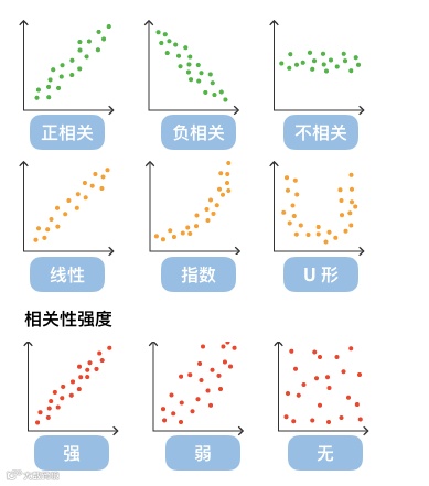 通过观察散点图上数据点的分布情况,我们可以推断出变量间的相关性。如果变量之间不存在相互关系,那么在散点图上就会表现为随机分布的离散的点,如果存在某种相关性,那么大部分的数据点就会相对密集并以某种趋势呈现。数据的相关关系主要分为:正相关(两个变量值同时增长)、负相关(一个变量值增加另一个变量值下降)、不相关、线性相关、指数相关等,表现在散点图上的大致分布如下图所示。那些离点集群较远的点我们称为离群点或者异常点。