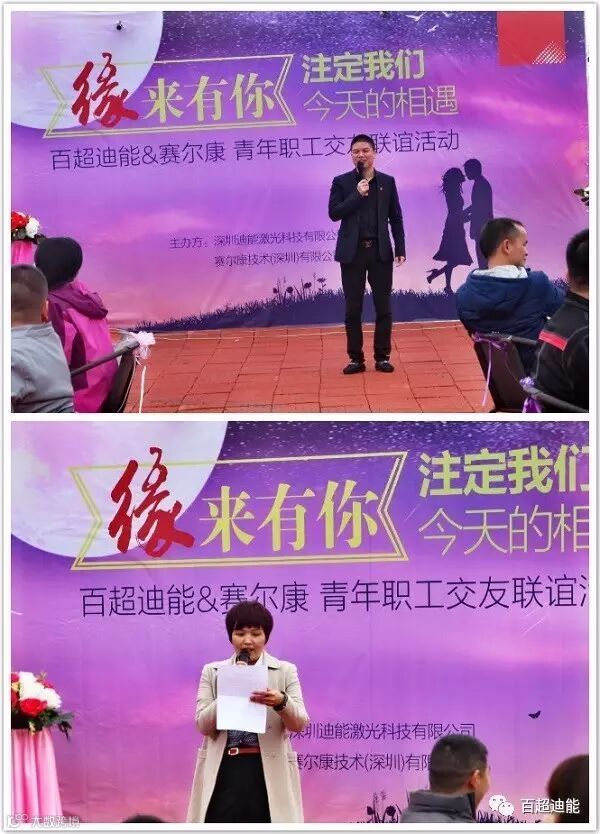 活动一开始,双方公司领导为大家献上了爱的祝福与叮嘱,对双方单身的青年职工的个人问题给予了亲切的关怀。前来监督指导本次活动的深圳市沙井新区新桥街道总工会专干陈桂秋先生对百超迪能与赛尔康两家公司给予员工个人问题的人文关怀大加赞赏,并对参与本次活动的男女青年给予了积极的鼓励。