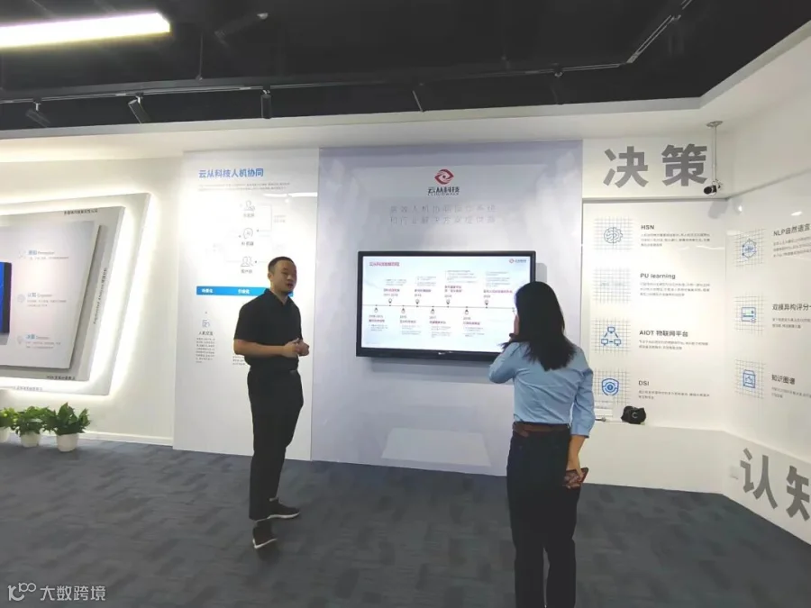 走进云从科技展厅,讲解员依次向促进会介绍了云从科技的发展历程、核心技术、科技产品等。云从科技成立于2015年,是南沙区首家科创板上市企业。公司凭借自主研发的人工智能核心技术打造人机协同操作系统,通过对全链的AI技术整合能力以及规模化高效的AI生产力的全面连接,为客户提供高效的人工智能服务。