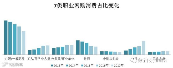 分析近5年的京东大数据用户画像会发现,白领虽然一直占据着网购的主要人群位置,但是蓝领、公务员和学生的占比在逐年上升,可见随着电商业务的发展,对于一些非互联网的核心用户群体来说,都在被慢慢渗透并成为电商的辐射人群。