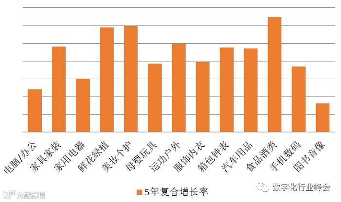 二、5年时间里,京东平台上食品酒类、美妆个护、鲜花绿植成为增长最快的三大品类