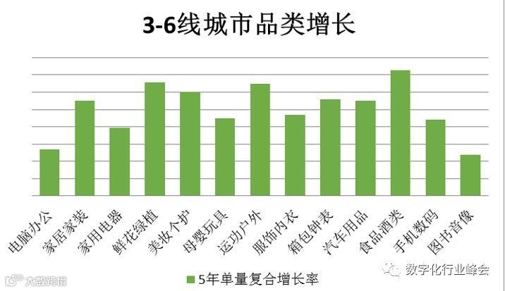 七、3-6线城市食品酒类、鲜花绿植、运动户外、美妆个护、家居家装品类增幅大