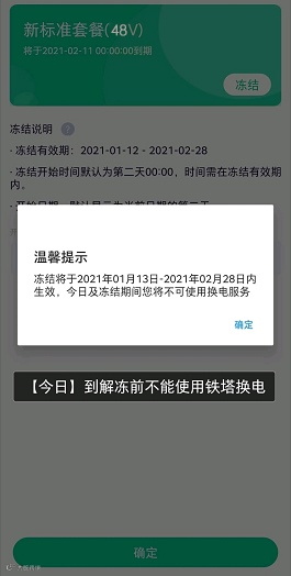 打开“铁塔换电APP”,点击“我的头像”,进入“个人中心”,点击下方的“冻结”图标,选择“冻结时间段”,最后点击“确定”按钮即可。