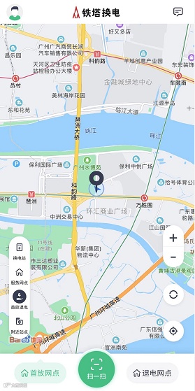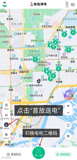 打开“铁塔换电”,点击左下角的“首放退电”,导航到有2个空仓以上的换电柜,并扫码退电。