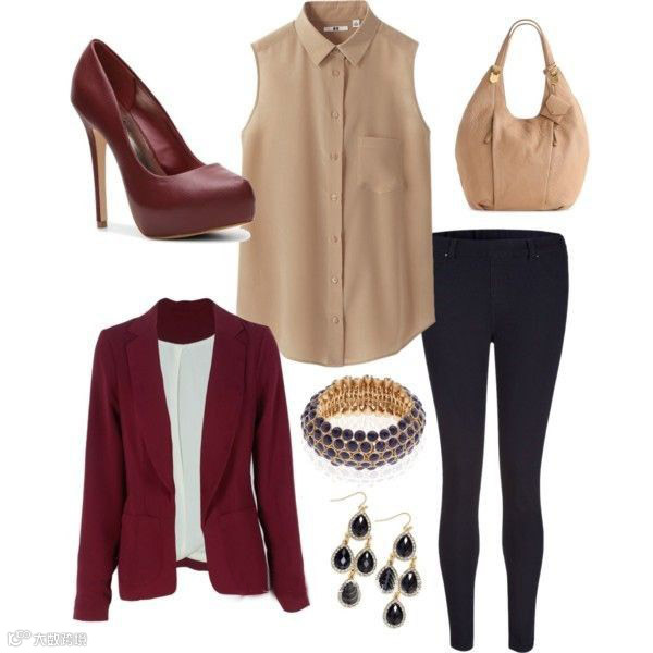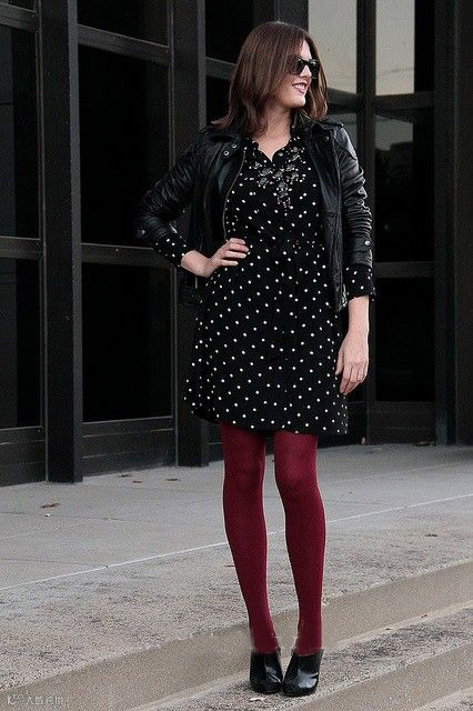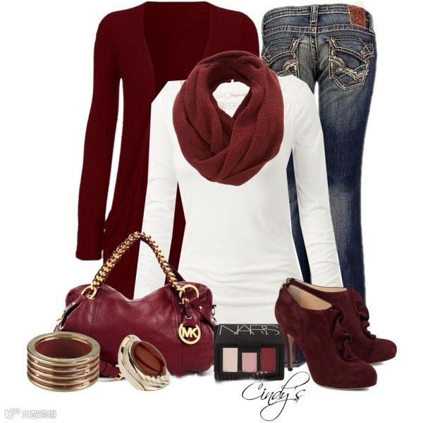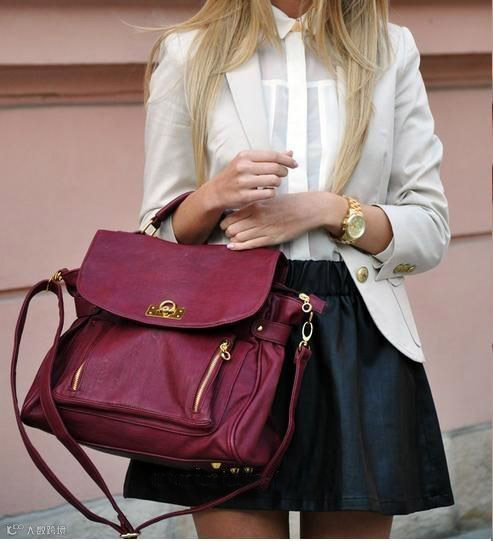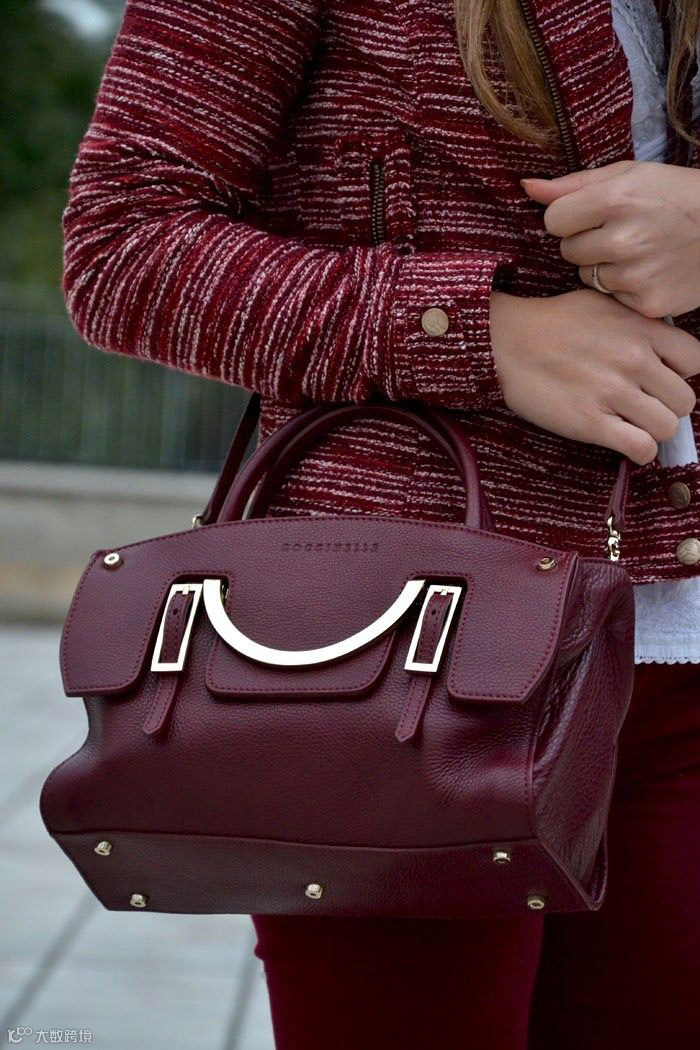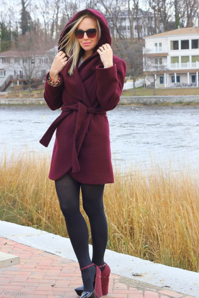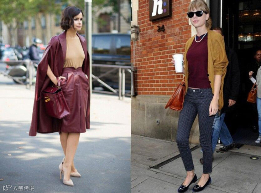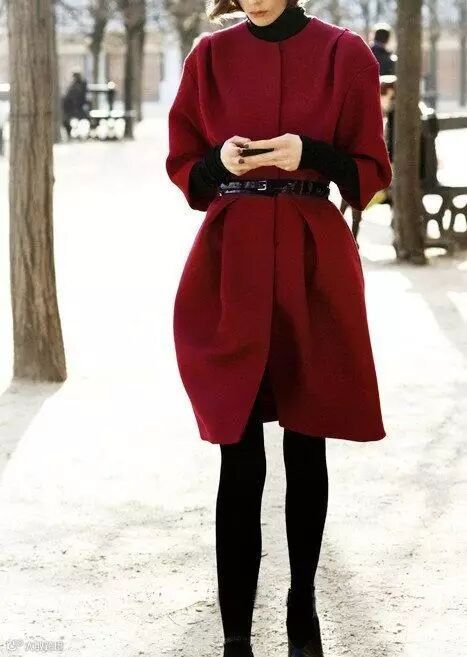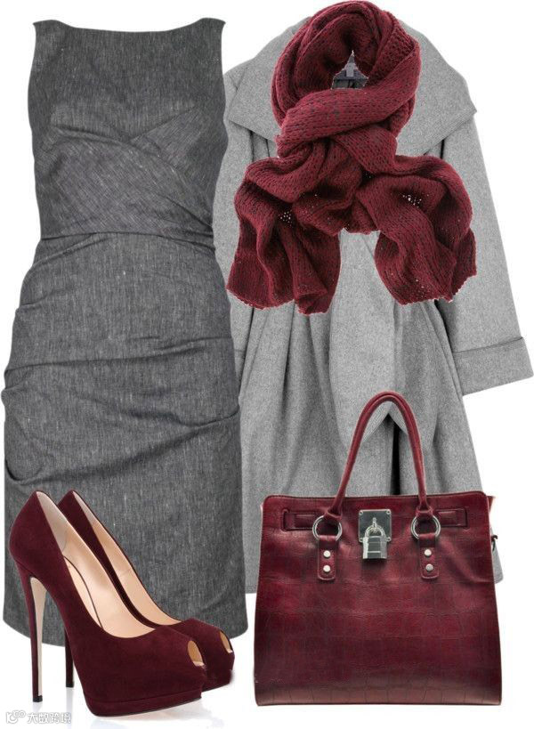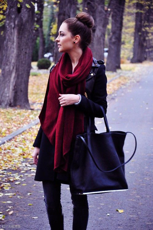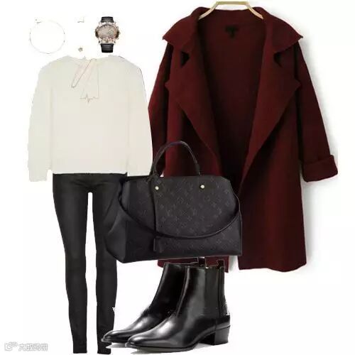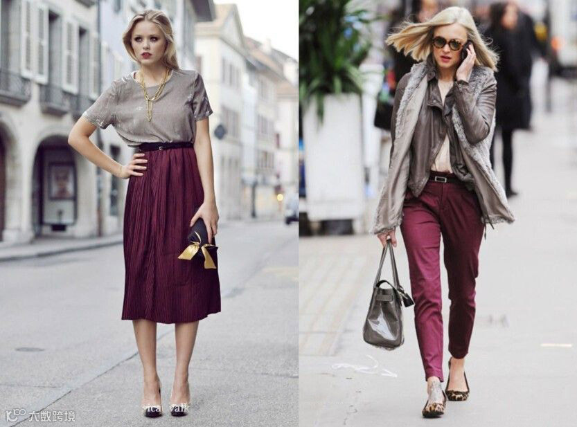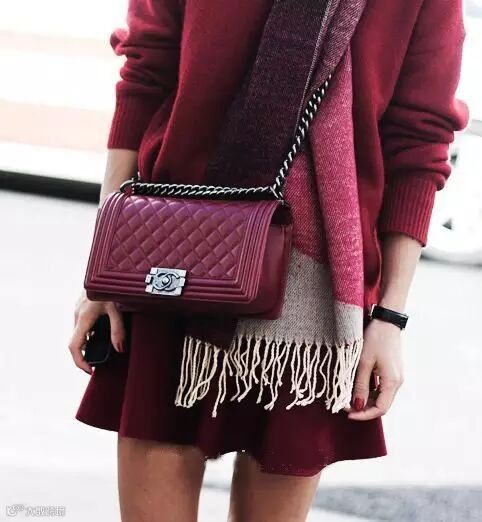 勃艮第酒红的明度与黑色极为相似,搭配在一起穿,最好在材质上能有所区分,并适当加入金属配件提亮,否则会没有层次感。