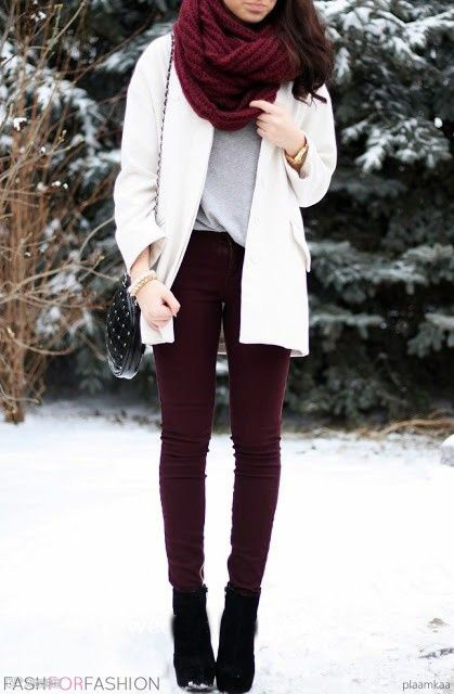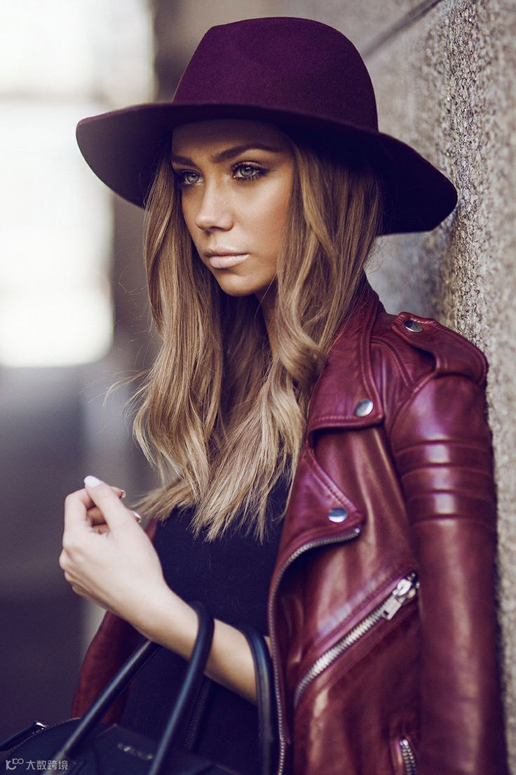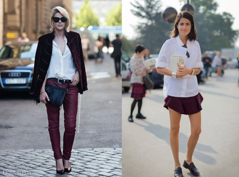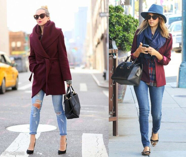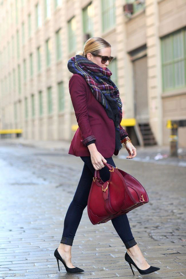 勃艮第酒红与牛仔在无形中成为了时尚街拍的最时髦的搭配。