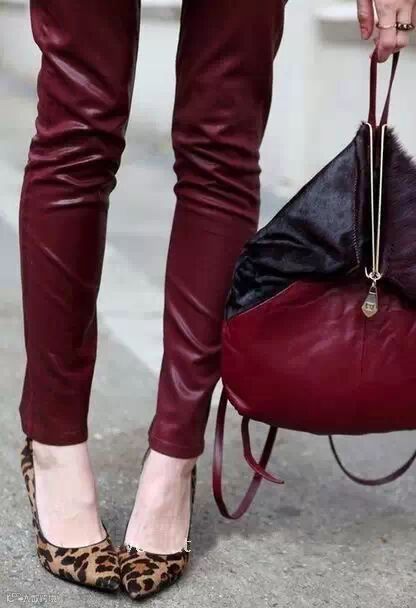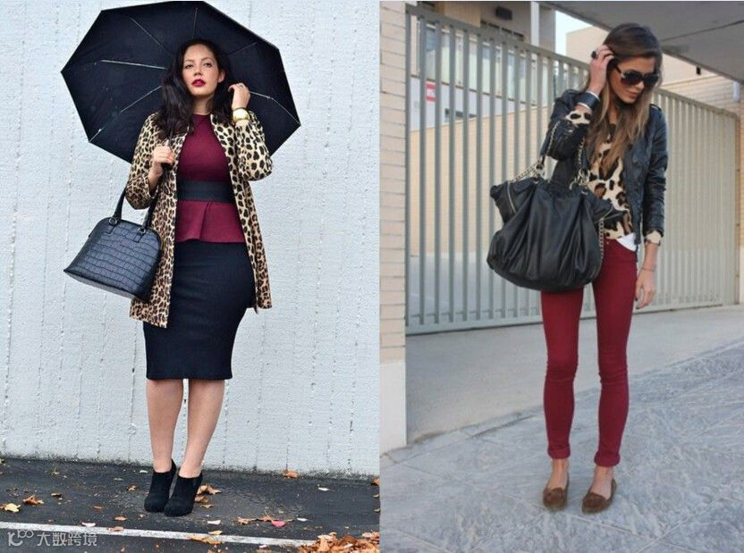 勃艮第酒红与豹纹搭配显得很有气场,很有欧美范。一股潮流的气息,让它开始变得前卫、硬朗、时尚、独立。