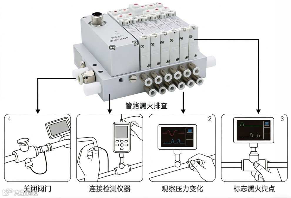 排查泄漏:用分段保压法+ 肥皂水检测,密封管接头、阀岛底座等泄漏点,更换老化密封圈。