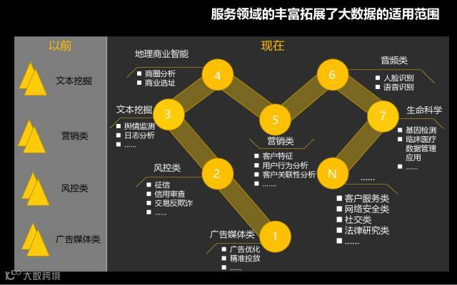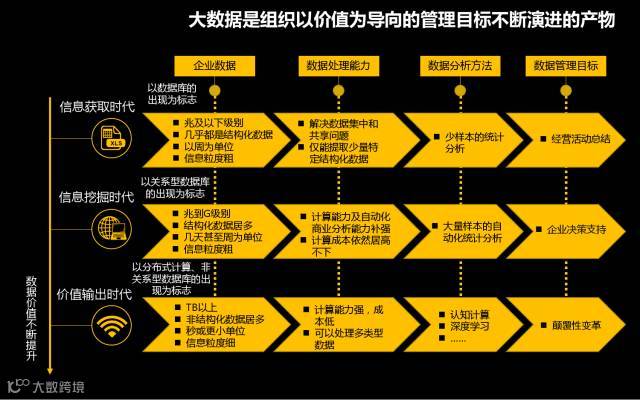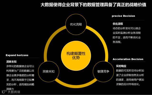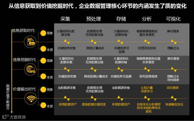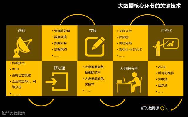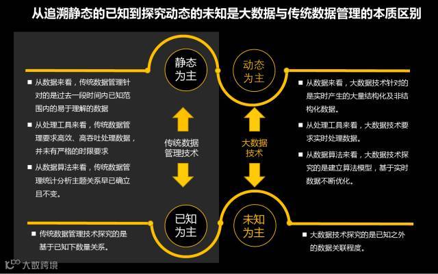 大数据新的数据获取技术、预处理技术、存储技术、分析技术、可视化技术等使用更高维度、模式的算法挖掘数据,从而洞察未知,使企业构建颠覆式变革成为可能。