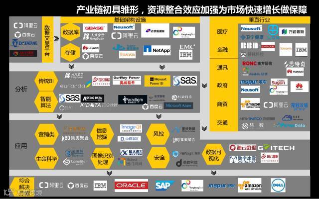 从2014年来看,大数据产业链发展不均衡,导致市场资源无法有效整合,厂商缺乏价值链条的传导,市场开拓情况不佳;而发展到现在,大数据市场产业链已逐渐完善,从基础设施层来看,存储、数据库厂商无论是数量还是质量保持稳定成长,从分析层的厂商来看,国内不断的涌现如机器学习类、认知计算等厂商,从应用层来看,初创厂商如雨后春笋般冒出,虽然这片市场鱼龙混杂,但面对剧烈的竞争,这片市场的厂商成长也最为迅速。