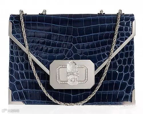 这款包包给人的第一感觉就是美得好华丽,好高贵,丝毫不掩饰自己鳄鱼皮的尊贵身价。深蓝色鳄鱼皮搭配天然白水晶,将纯银链条卸下来之后,就是一款完美的晚宴包。设计这款手袋的红毯礼服女王Marchesa果然最懂女人心。