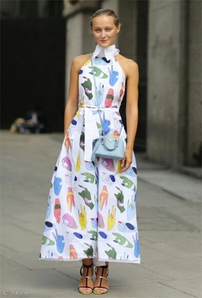 搭配秘诀:轻柔单彩色迷你小挎包+彩色波普图案连衣裙+拼色细带高跟凉鞋+淡雅妆容