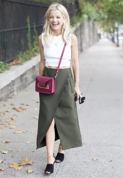 搭配秘诀:玫红色皮革小挎包+军绿色前开衩高腰半身裙+纯白露脐背心+黑色墨镜