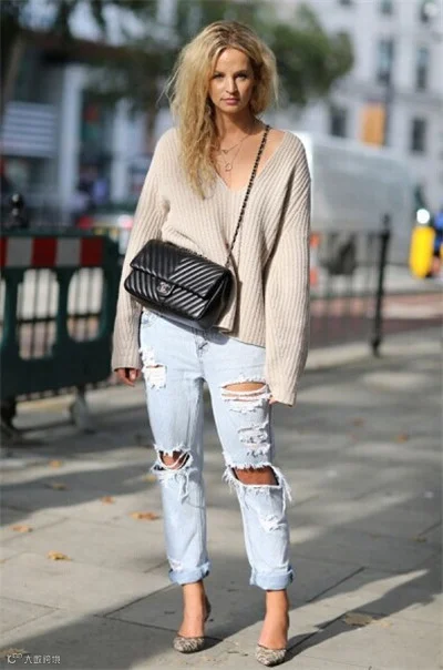 搭配秘诀:黑色链条包+大V领毛衣+破洞男友牛仔裤+豹纹高跟鞋+蓬松凌乱的卷发