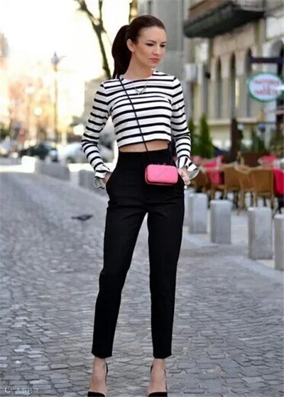 搭配秘诀:黑色链条包+运动胸衣+西服外套+卷腿单宁裤+高跟鞋