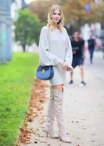 搭配秘诀:小号链条包+灰白色针织裙+灰白色过膝长靴