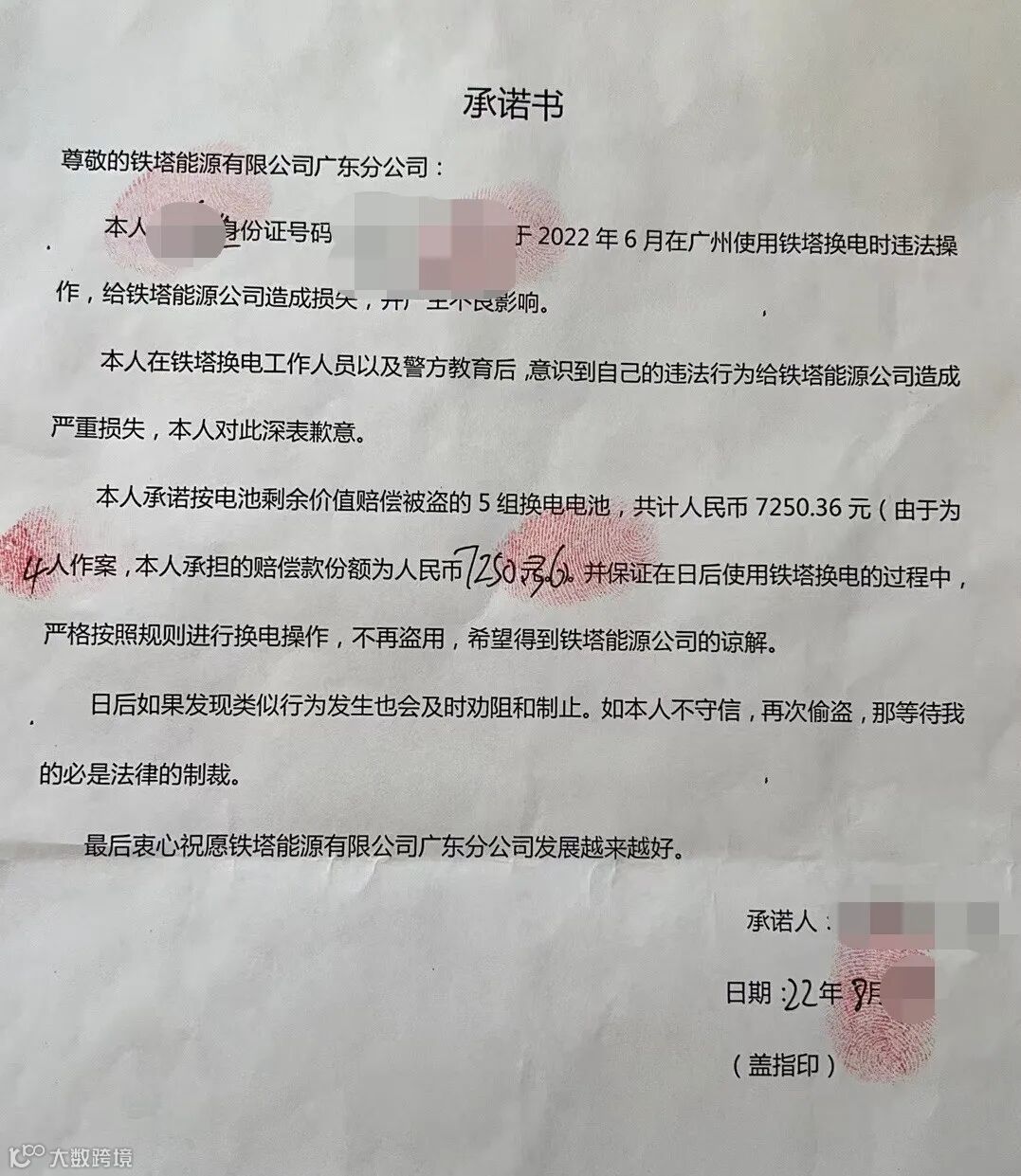 该嫌疑人在不到两个星期的时间内,在多个换电站“拿”走了6个电池。经过铁塔工作人员以及警方教育后,嫌疑人欧某对自己的违法行为懊悔不已,并对损失做出了赔偿!