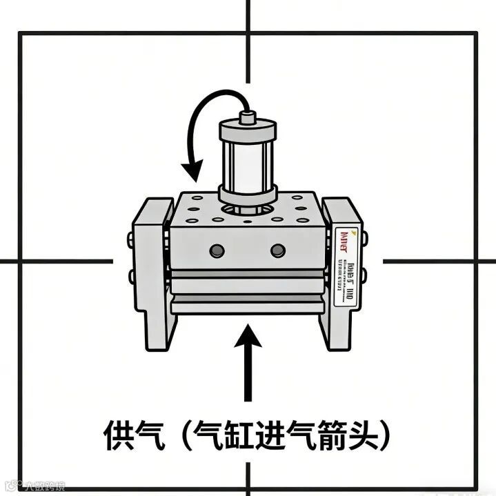 4. 释放阶段:电磁阀换向,压缩空气进入气缸另一腔,夹爪反向运动释放工件。