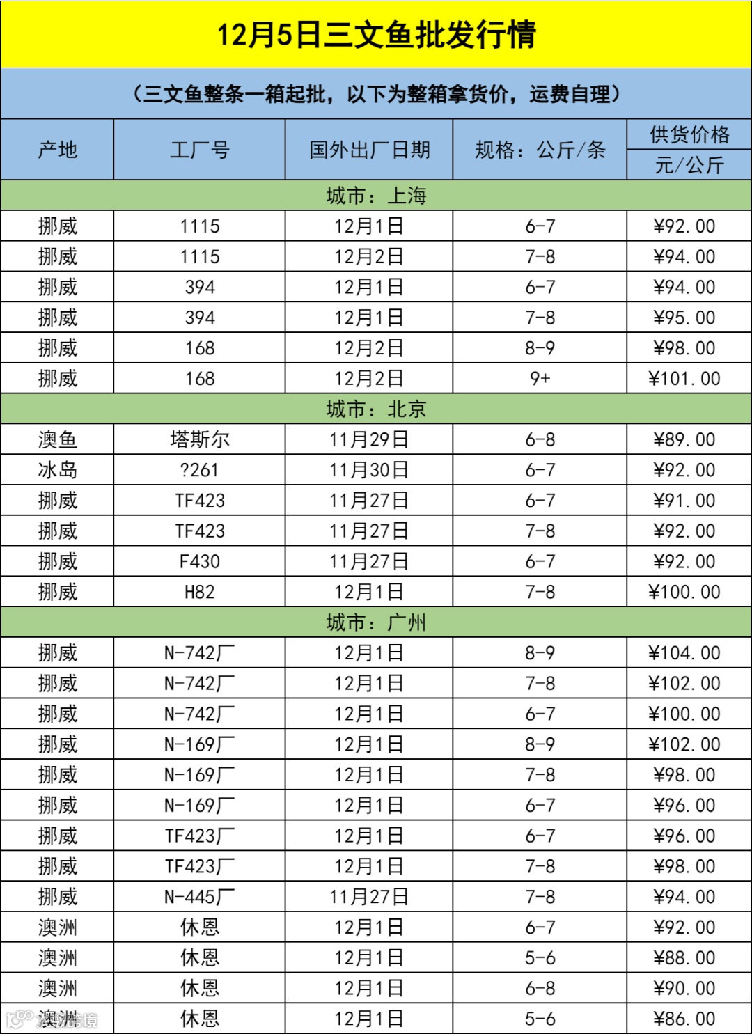 12月5日三文鱼批发行情(上海|北京|广州)