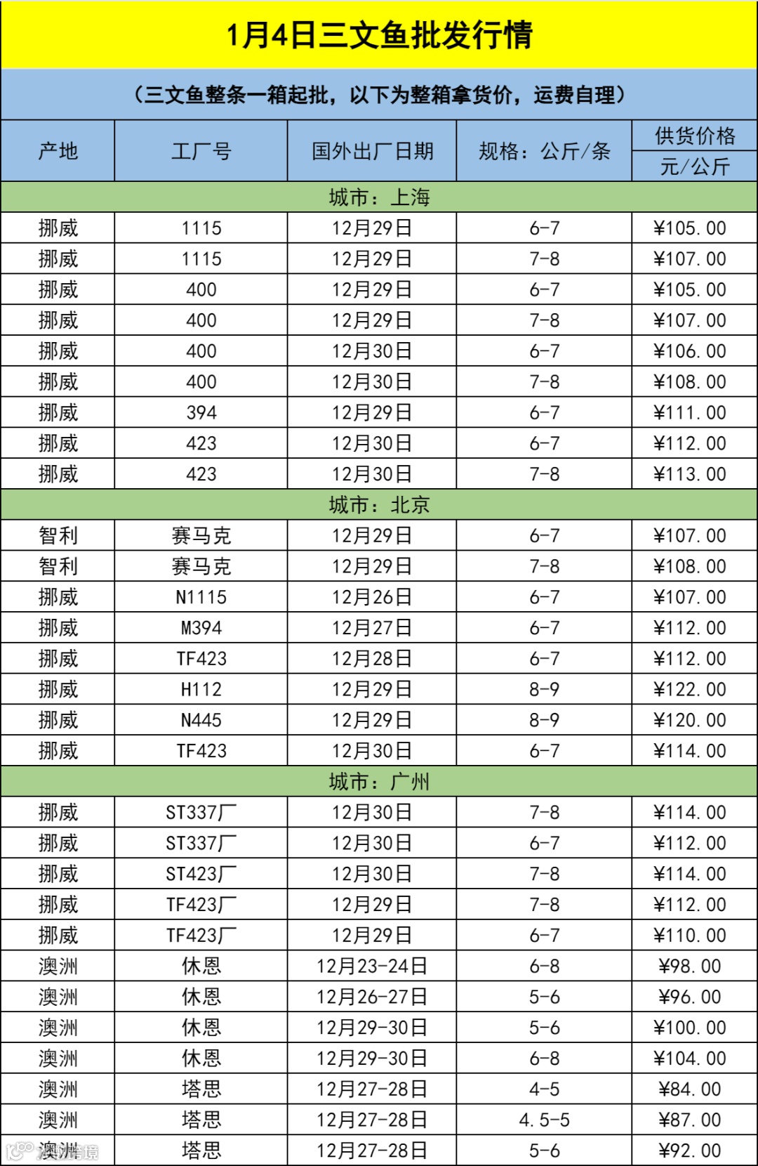 1月4日三文鱼批发行情(上海|北京|广州)