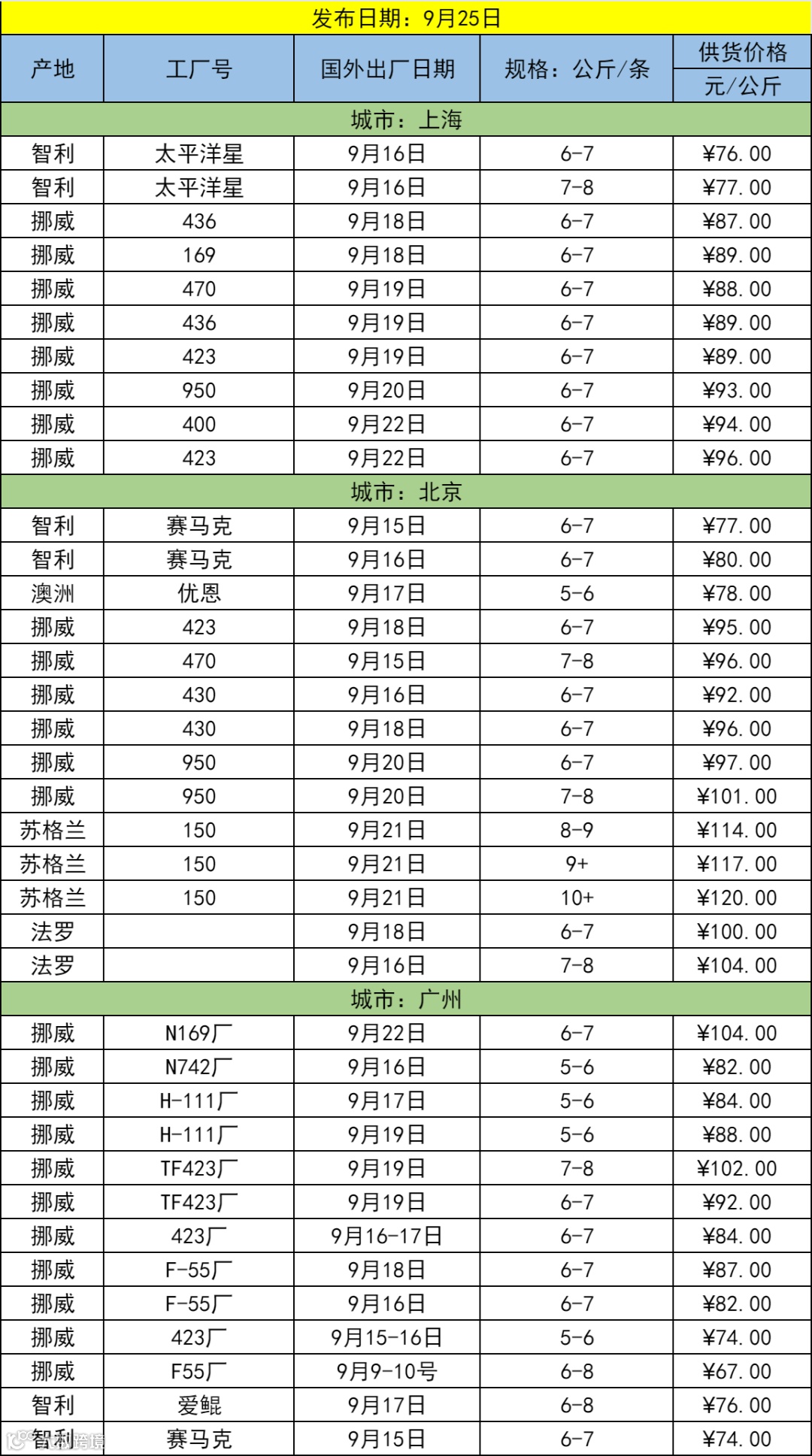 9月25日三文鱼批发行情(上海|北京|广州) 三文鱼批发行情