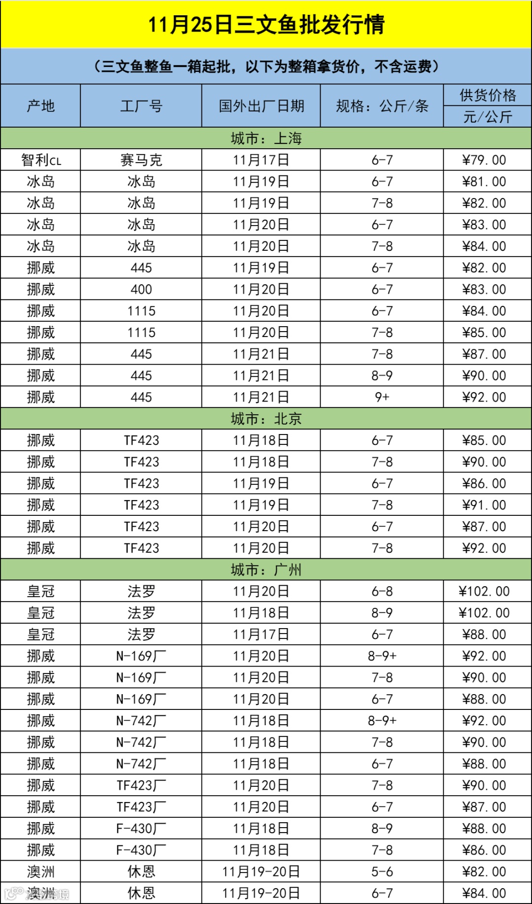 11月25日三文鱼批发行情(上海|北京|广州)