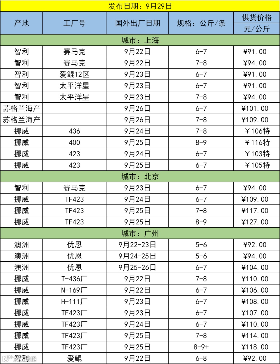 9月29日三文鱼批发行情(上海|北京|广州) 三文鱼批发行情