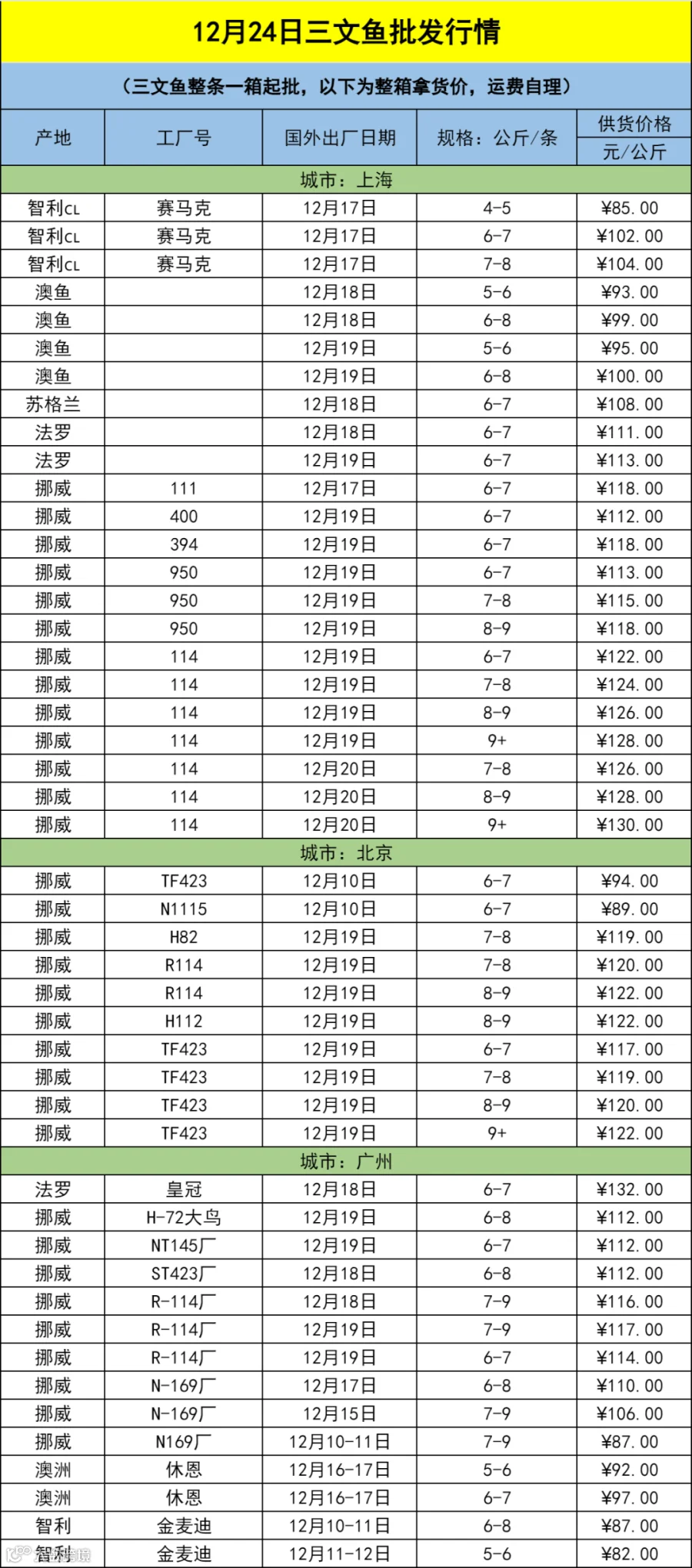 12月24日三文鱼批发行情(上海|北京|广州)