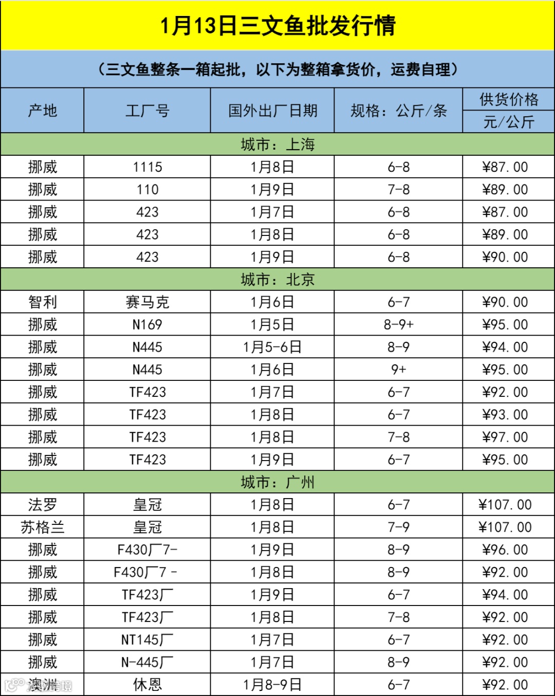1月13日三文鱼批发行情(上海|北京|广州) 三文鱼批发行情