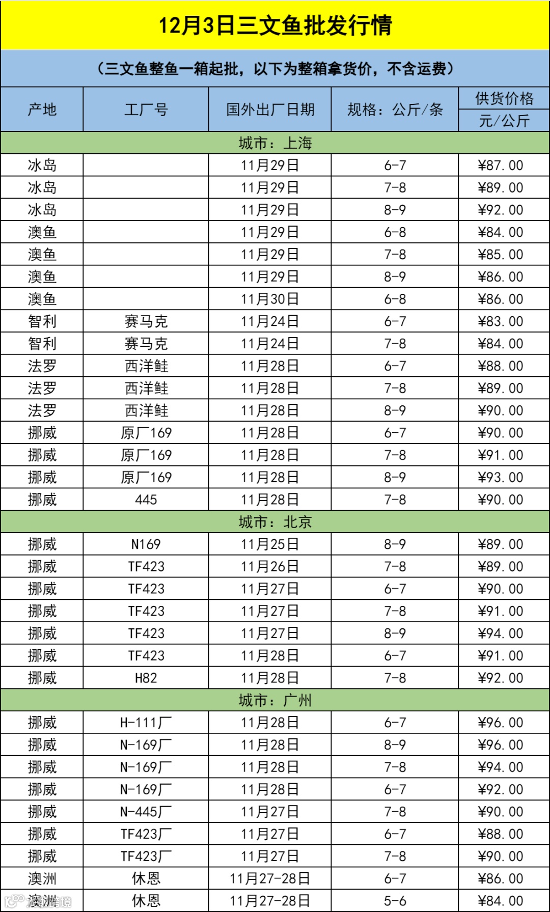 12月3日三文鱼批发行情(上海|北京|广州)