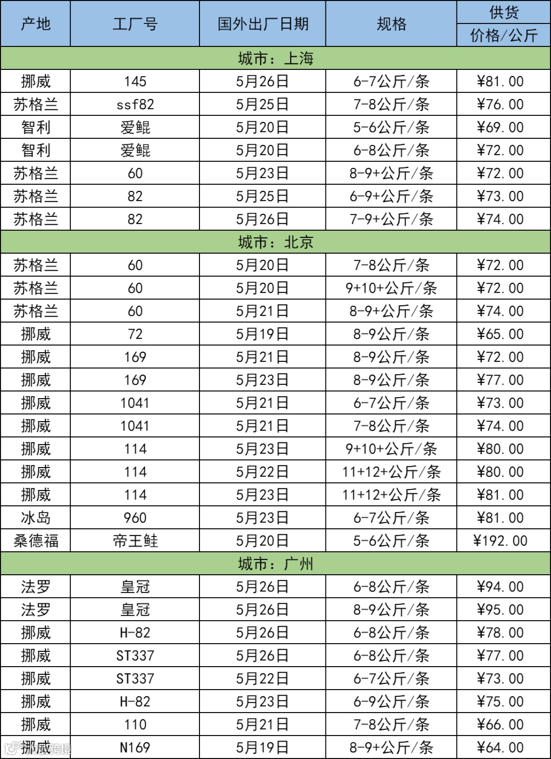 5月29日三文鱼批发行情(上海|北京|广州)