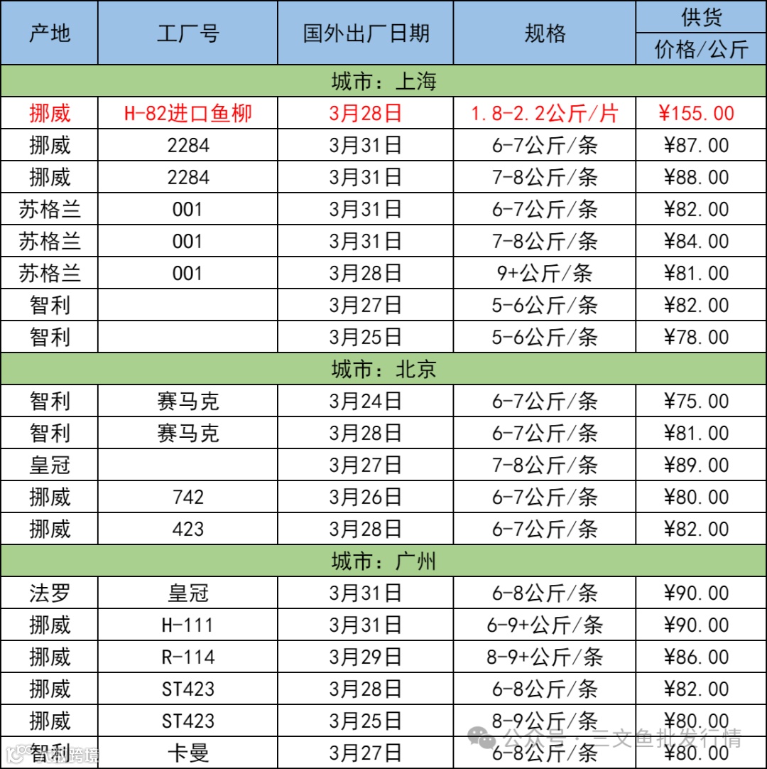 4月3日三文鱼批发行情(上海|北京|广州)