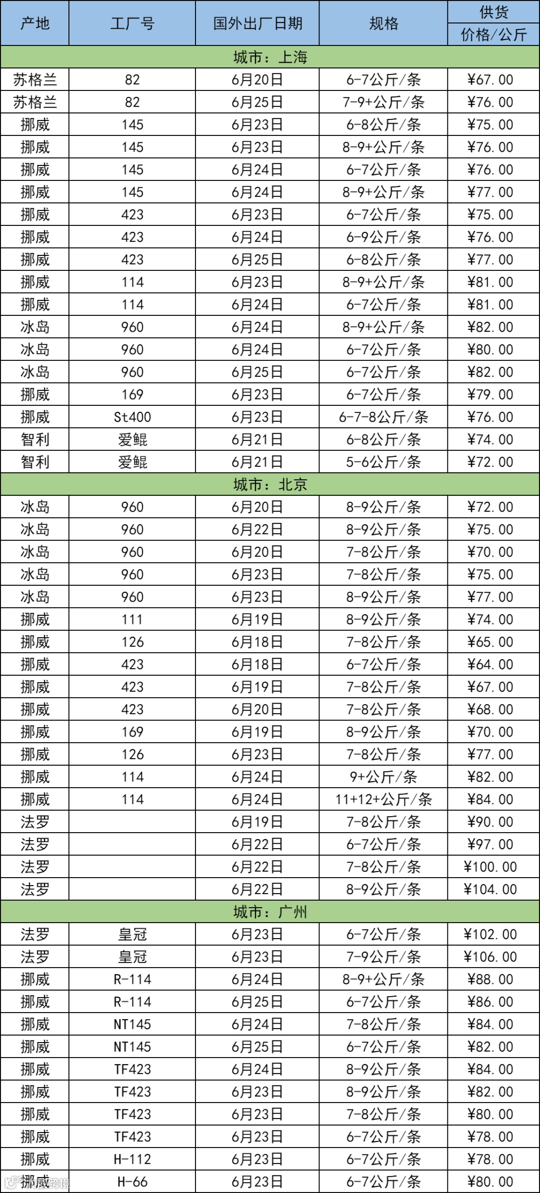 6月28日三文鱼批发行情(上海|北京|广州)