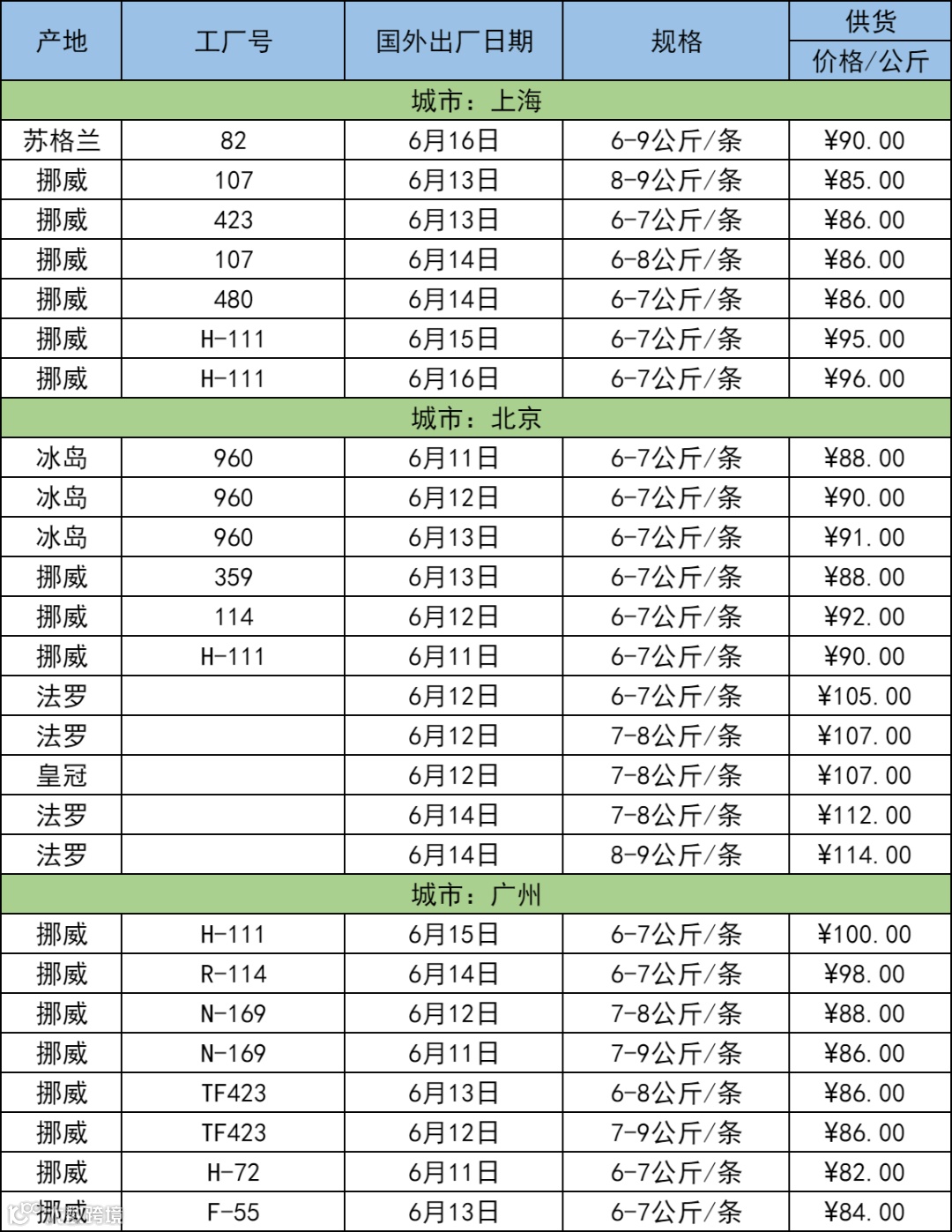 6月19日三文鱼批发行情(上海|北京|广州)