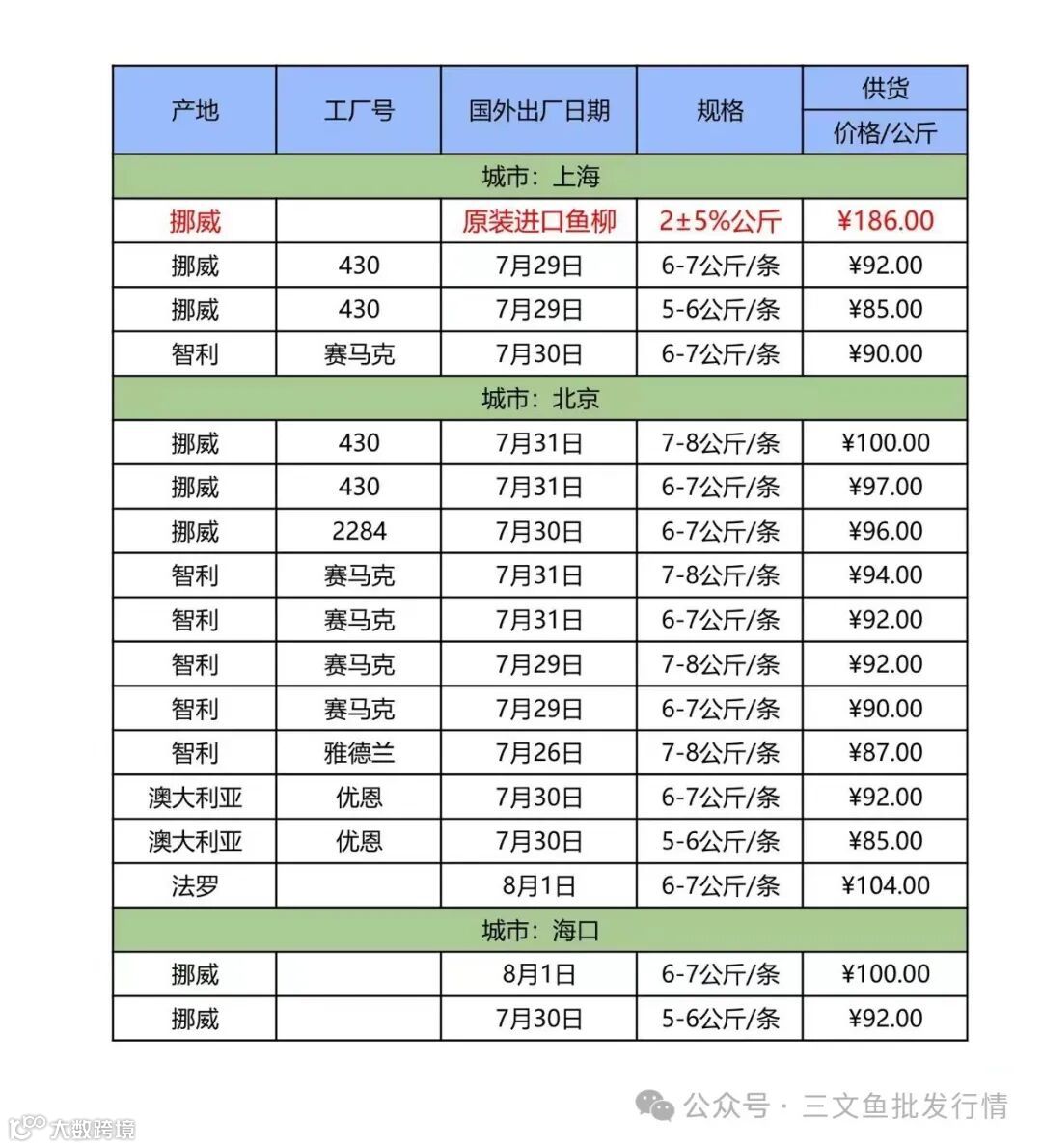 6、欢迎关注[三文鱼批发行情],每天更新当天市场价格,及时分享市场各大重要资讯。