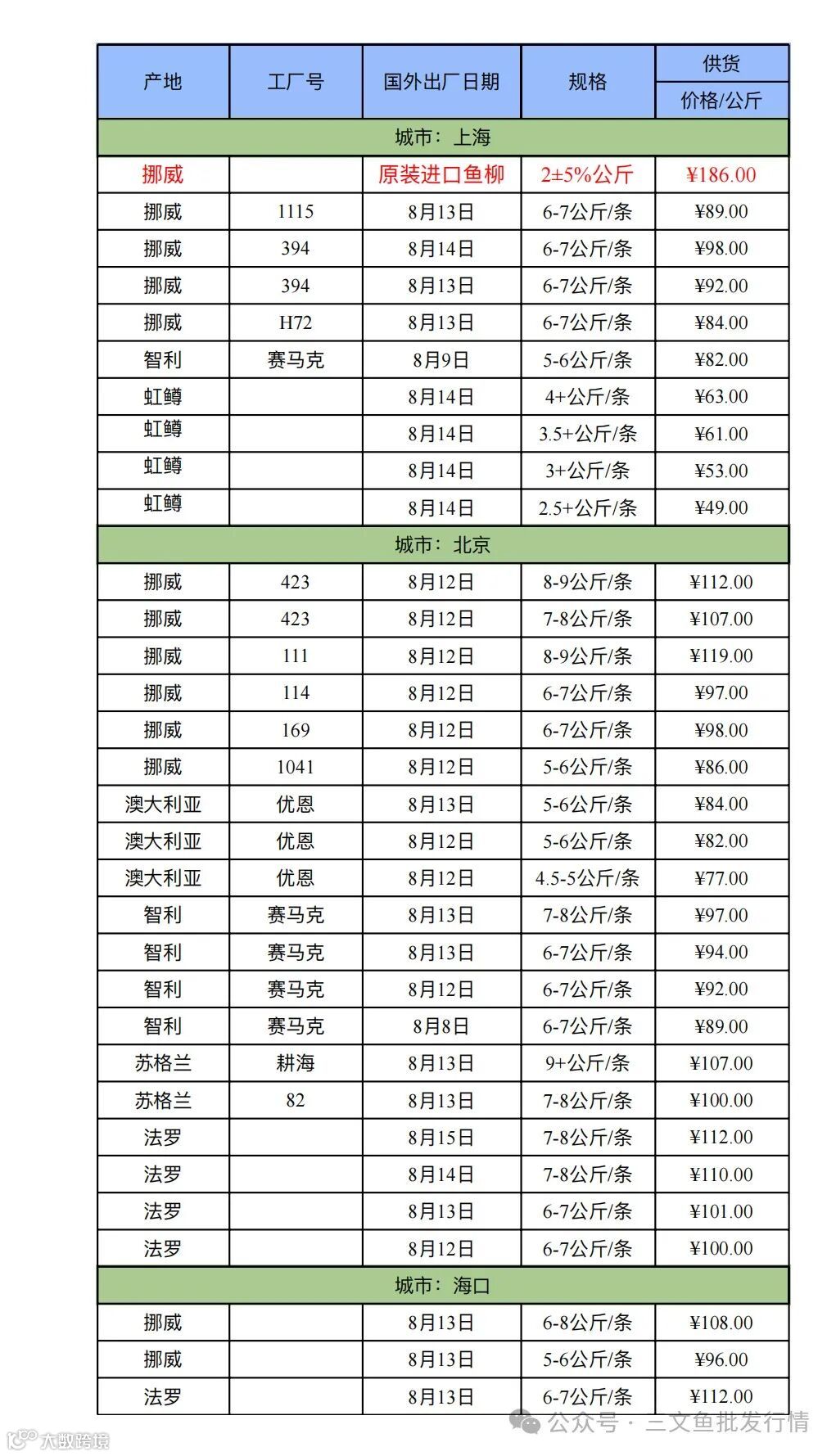 6、欢迎关注[三文鱼批发行情],每天更新当天市场价格,及时分享市场各大重要资讯。
