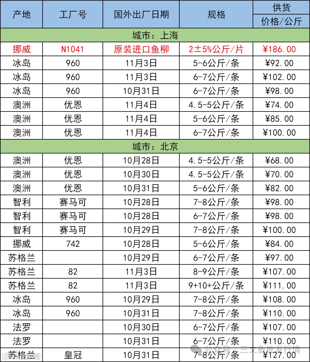 11月7日三文鱼批发行情(上海|北京)