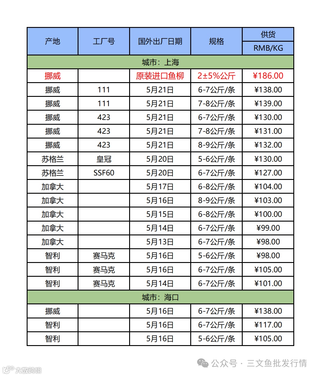 5月24日三文鱼批发行情(上海|海口)