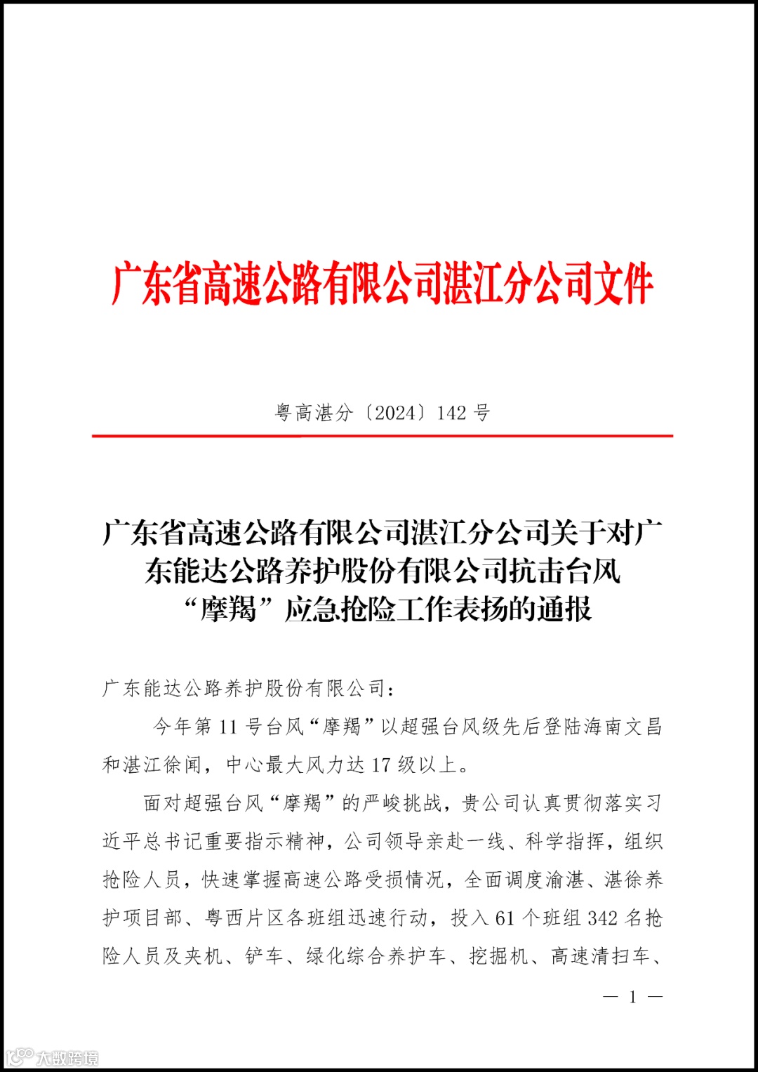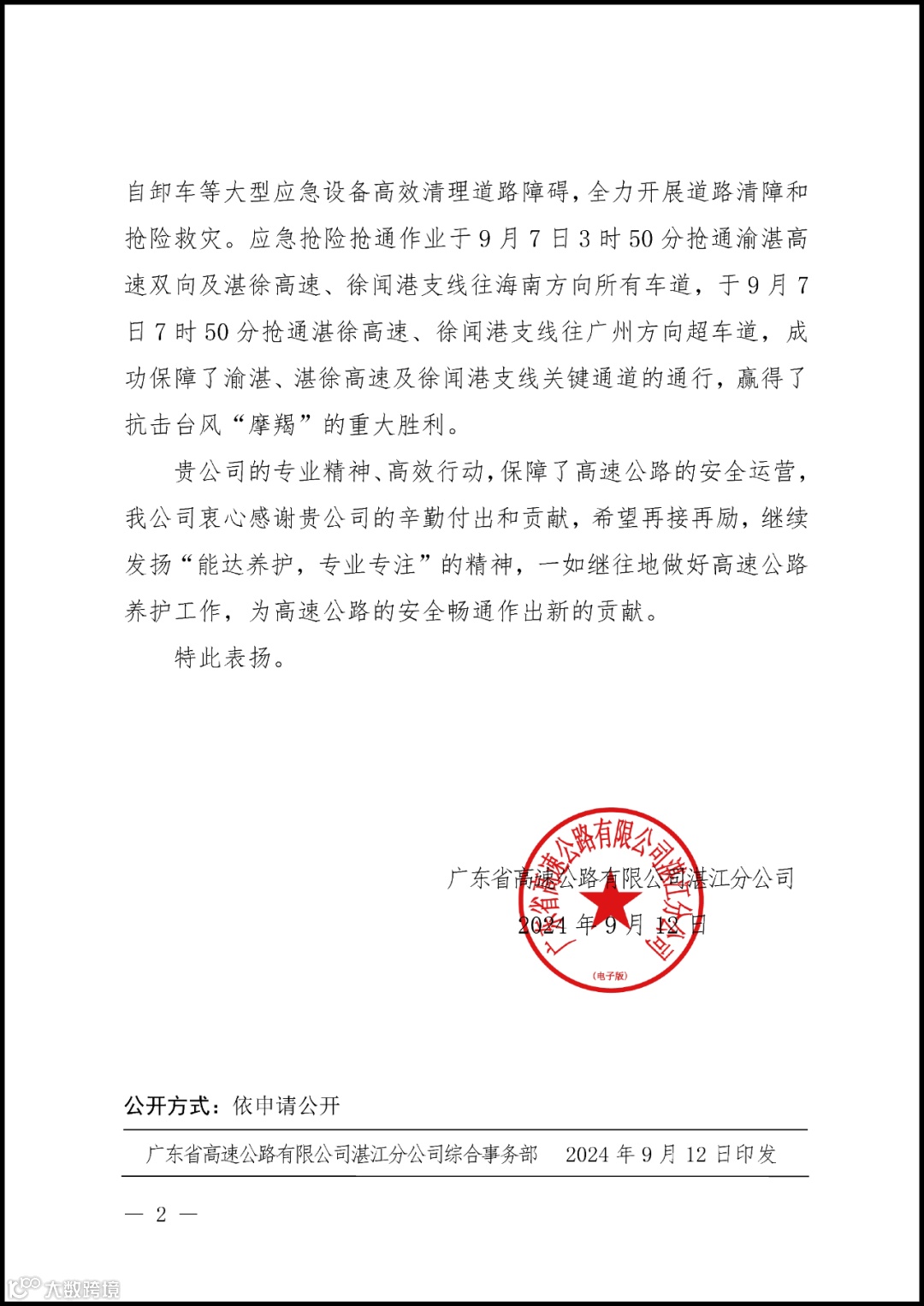 图|9月12日,广东省高速公路有限公司湛江分公司发出通报,对我司在抗击台风“摩羯”工作中的出色表现给予表扬。