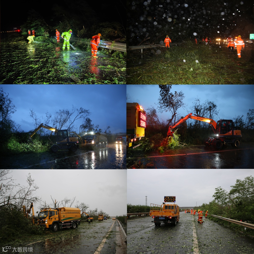 图|台风登陆后,广东能达应急抢险先锋队第一时间前往抢险一线作战,多台抢险设备配合默契,快速抢通保畅。