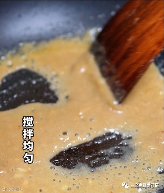 ⑤余下的油,放入姜末,倒入咖喱酱,加水稀释,搅拌均匀
