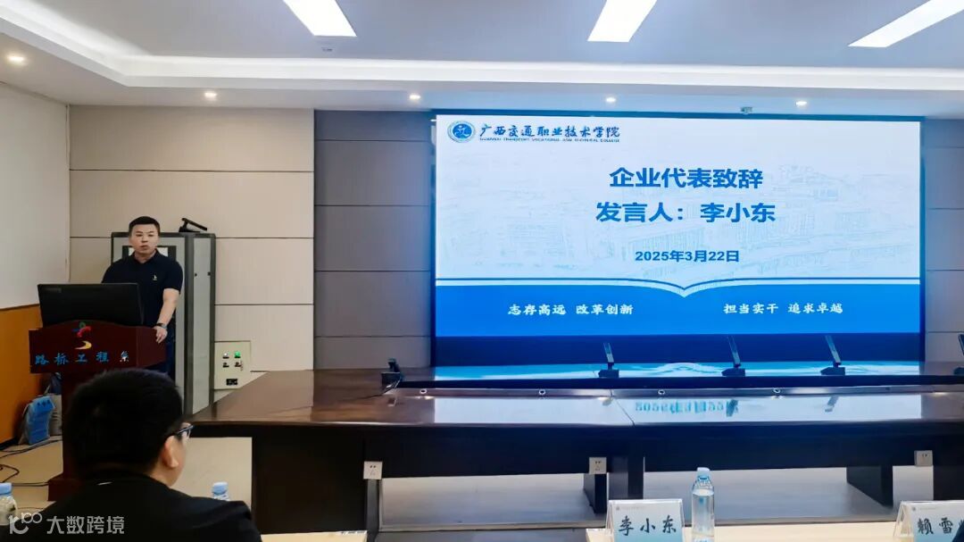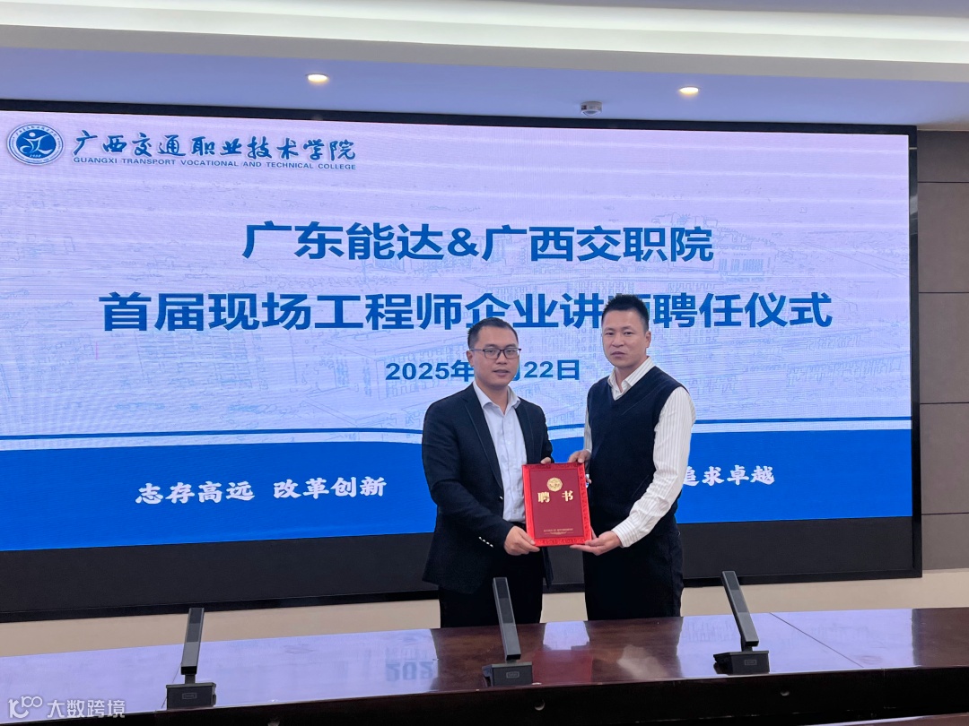 图|广西交职院路桥学院副院长严世涛代表学校向能达公司讲师团队代表吴秋展发放校外讲师聘书。