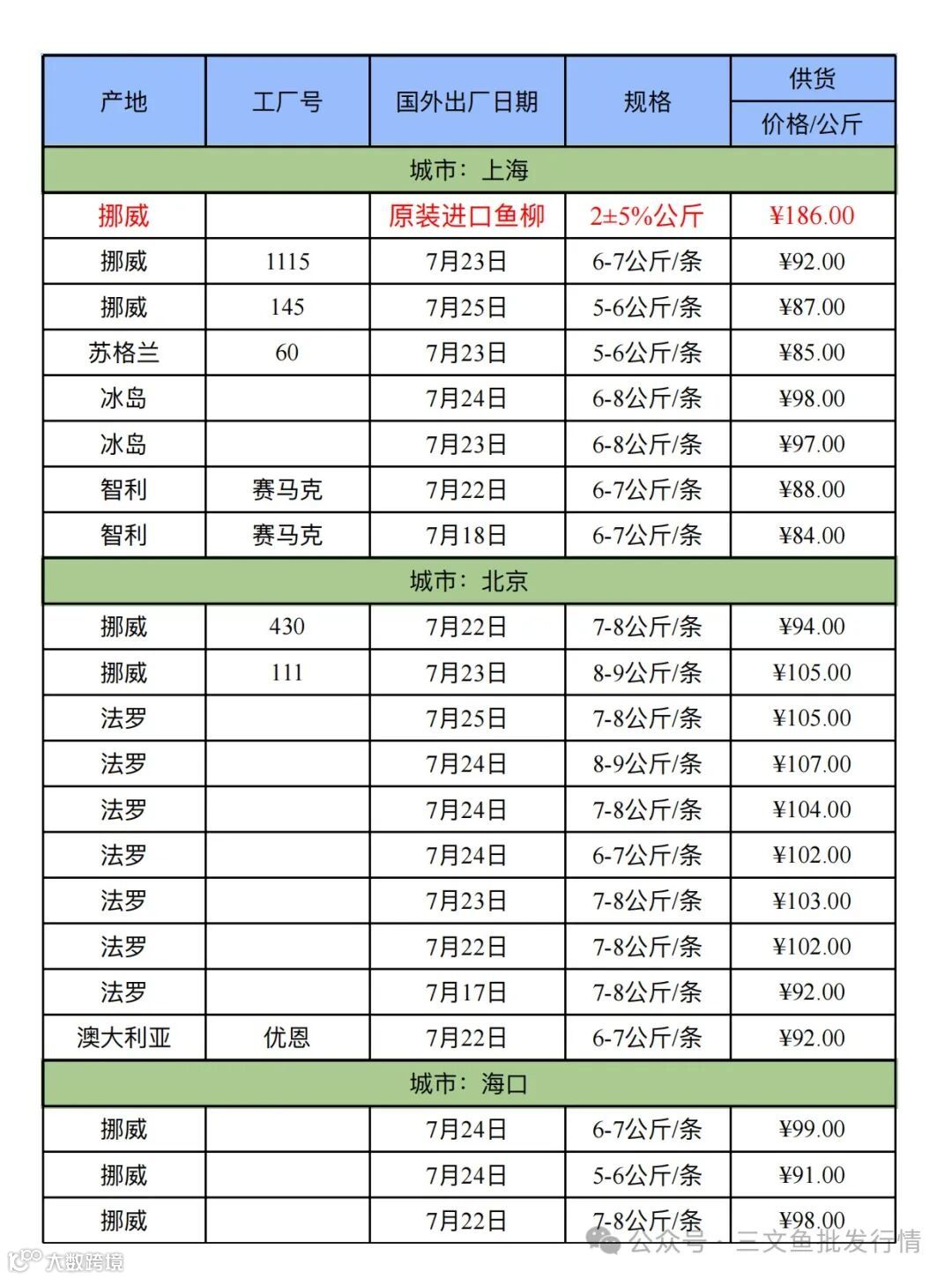 6、欢迎关注[三文鱼批发行情],每天更新当天市场价格,及时分享市场各大重要资讯。