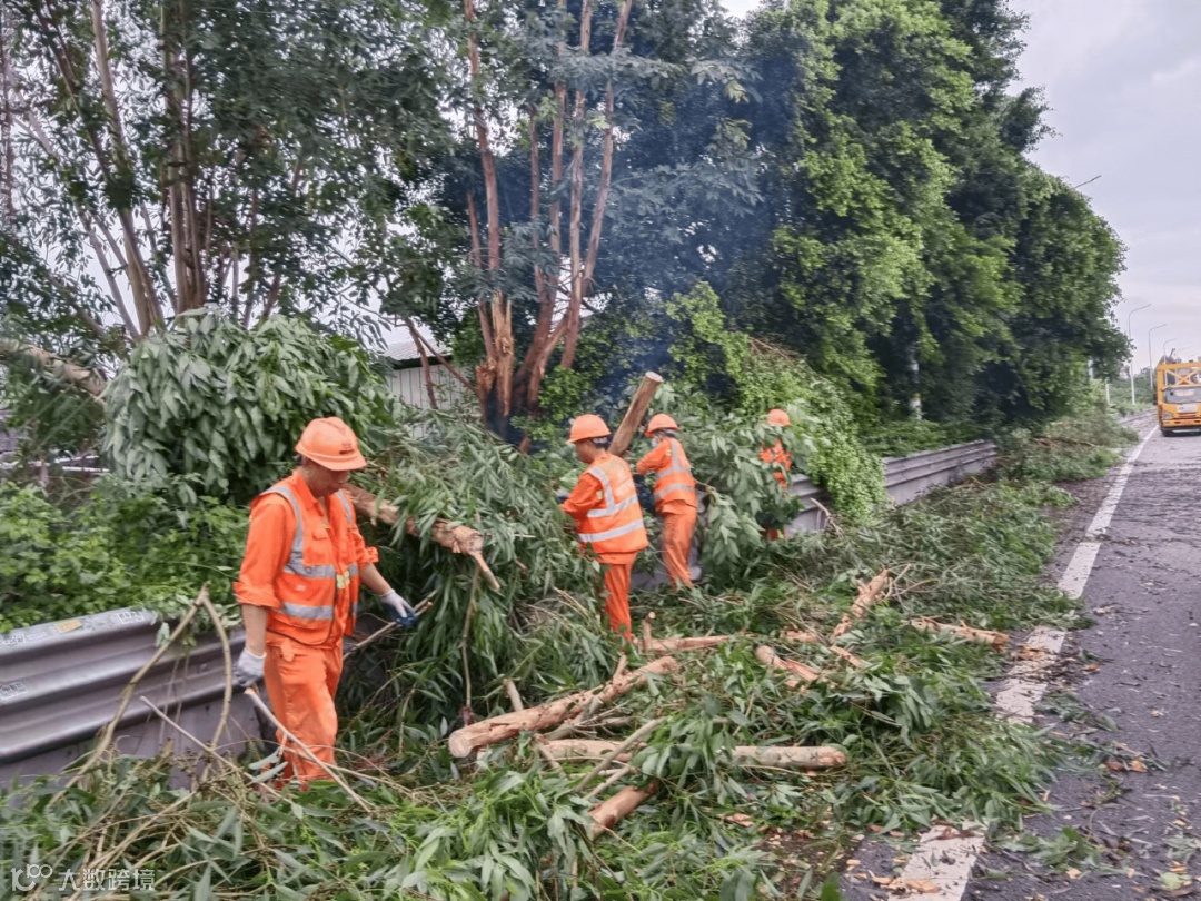 公司广佛项目部迅速投入8个班组共45人、2台防撞车、2台扫路车、2台高空车、8台施工作业车等应急设备开展抢险,及时处理了事故现场及大量路侧乔木和因龙卷风吹至路面的房屋顶棚等,经过8小时的连续抢险,现场交通恢复正常秩序。
