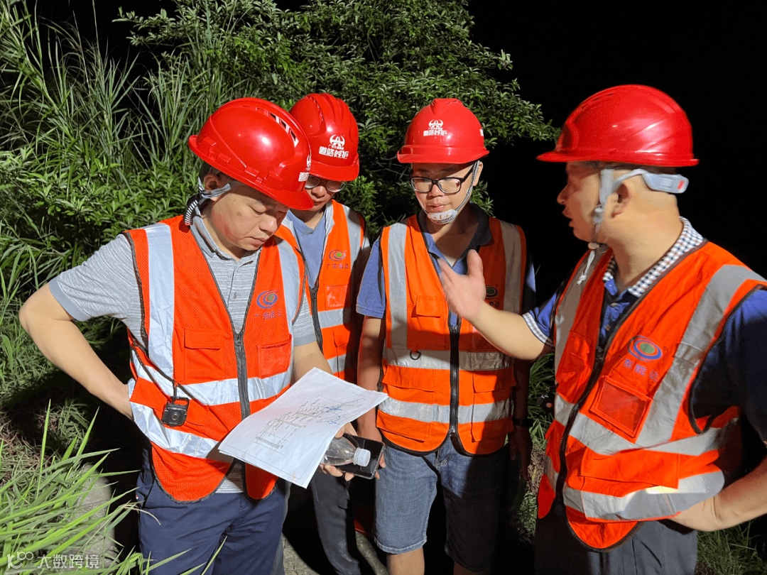 2022年6月24日深夜,公司黄勇总经理(左一)、刘凤山副总经理(右一)在连英高速K378边坡坡顶指导工作。