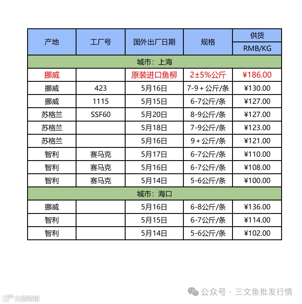 5月22日三文鱼批发行情(上海|海口)