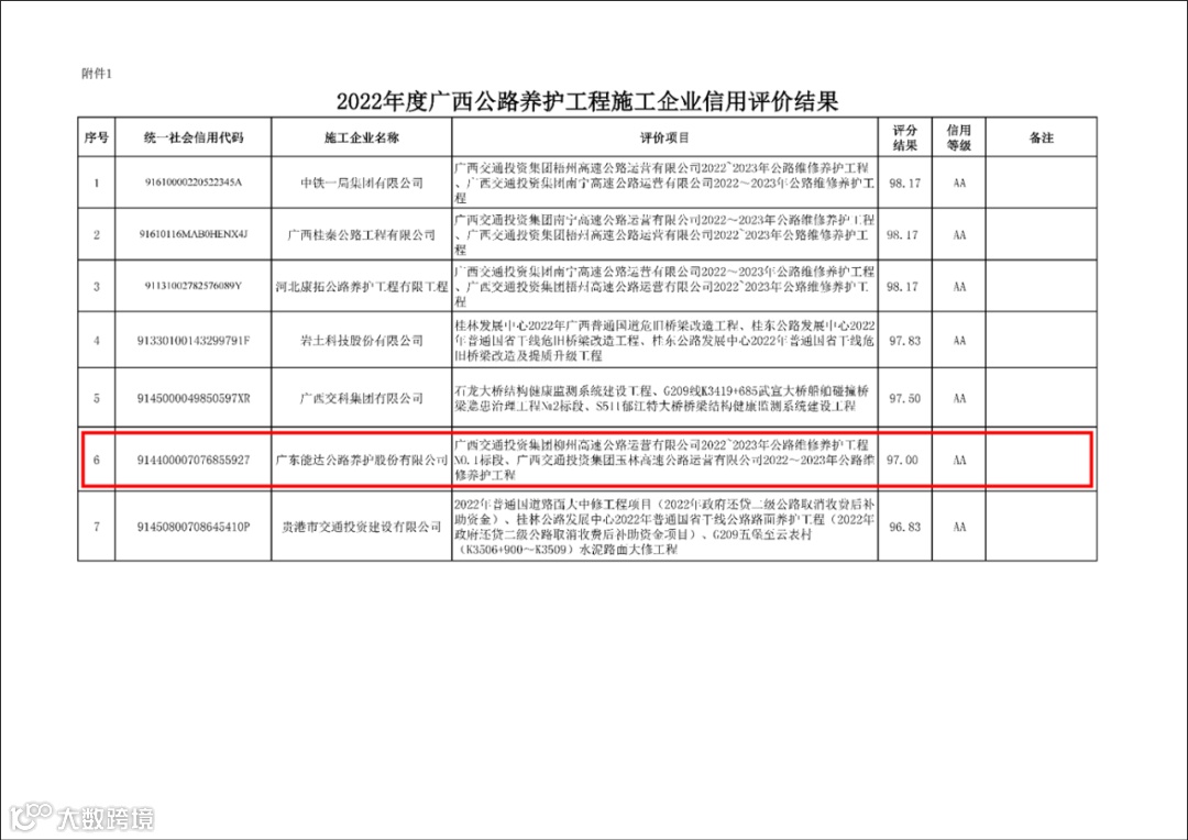 2023年4月18日,广西壮族自治区交通运输厅公布2022年度广西公路养护工程施工信用评价结果。能达公司作为广西交通投资集团柳州高速公路运营有限公司2022~2023年公路维修养护工程NO.1标段、广西交通投资集团玉林高速公路运营有限公司2022~2023年公路维修养护工程的施工企业,在97家广西公路养护工程参评施工企业信用评价结果中荣获AA级信用等级。
