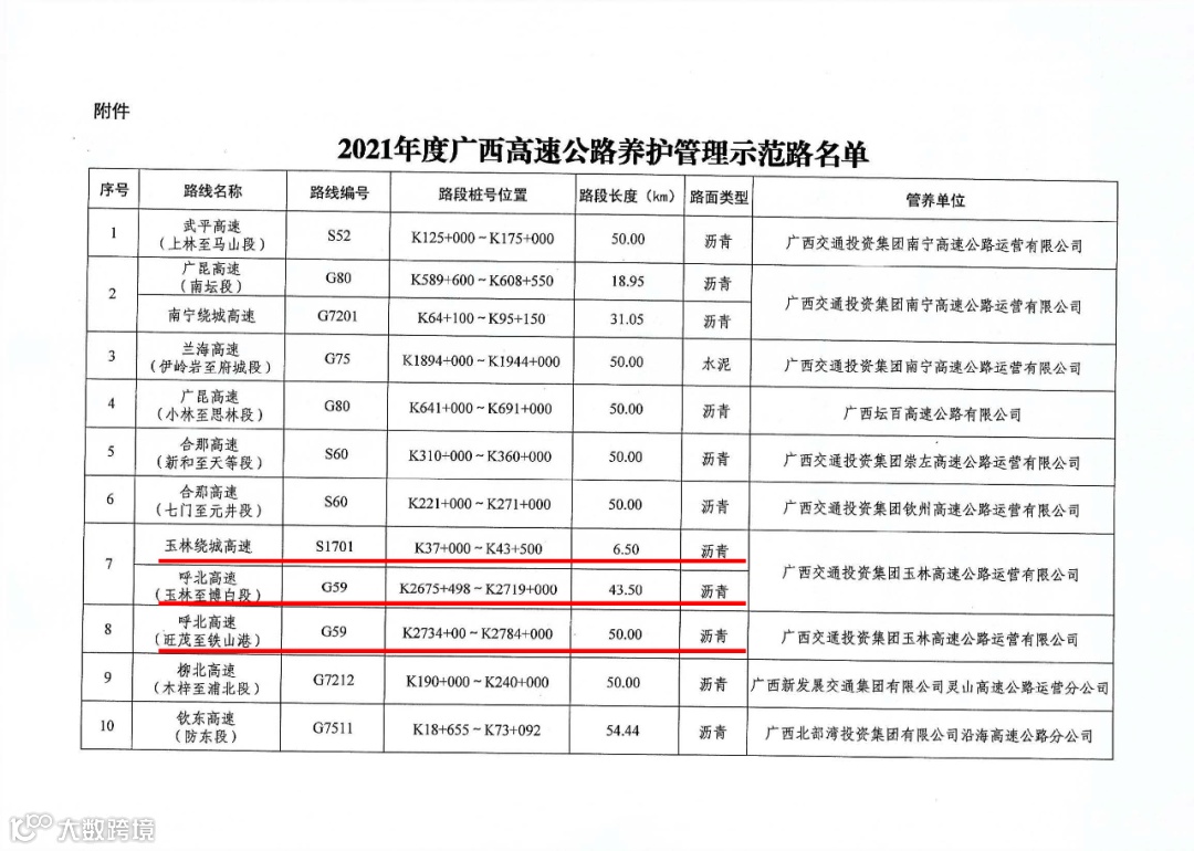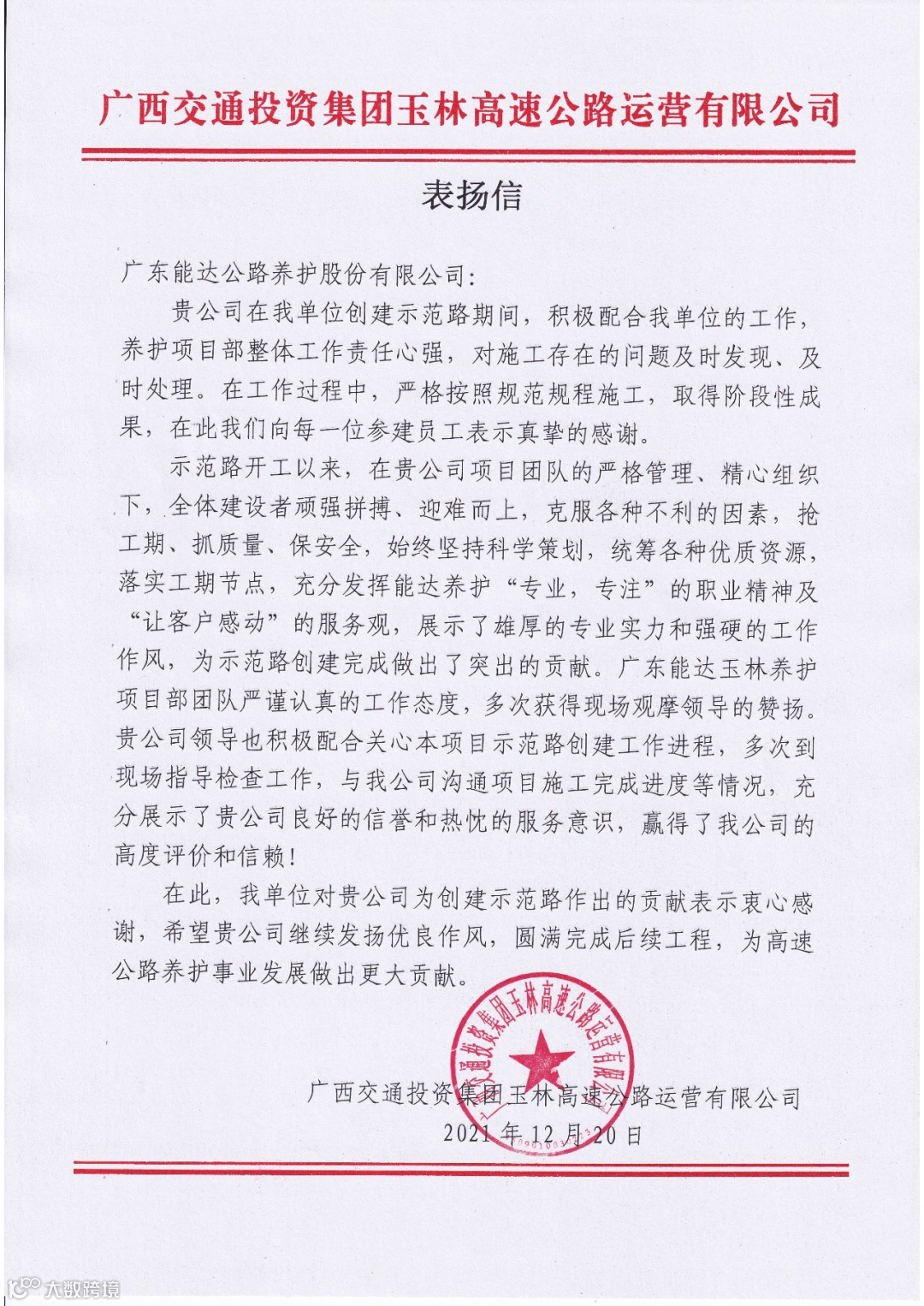 在本次争创养护管理示范路过程中,能达广西分公司及各养护项目部积极配合养护路段的运营单位,通过精细化严格管理,精心组织、顽强拼搏,大力推行“预防性养护”模式,落实沿线构造物病害处治、绿化覆绿、路容路貌整治、排水系统清疏等全面养护工作,始终坚持科学策划,统筹各种优质资源,落实工期节点,保安全、保路况、保畅通,达到了“畅、安、舒、美”的路况效果,最终取得了示范路评审组的肯定,受到了各路段业主的一致好评。其中,广西交通投资集团玉林高速公路运营有限公司还特此为公司发来一封表扬信: