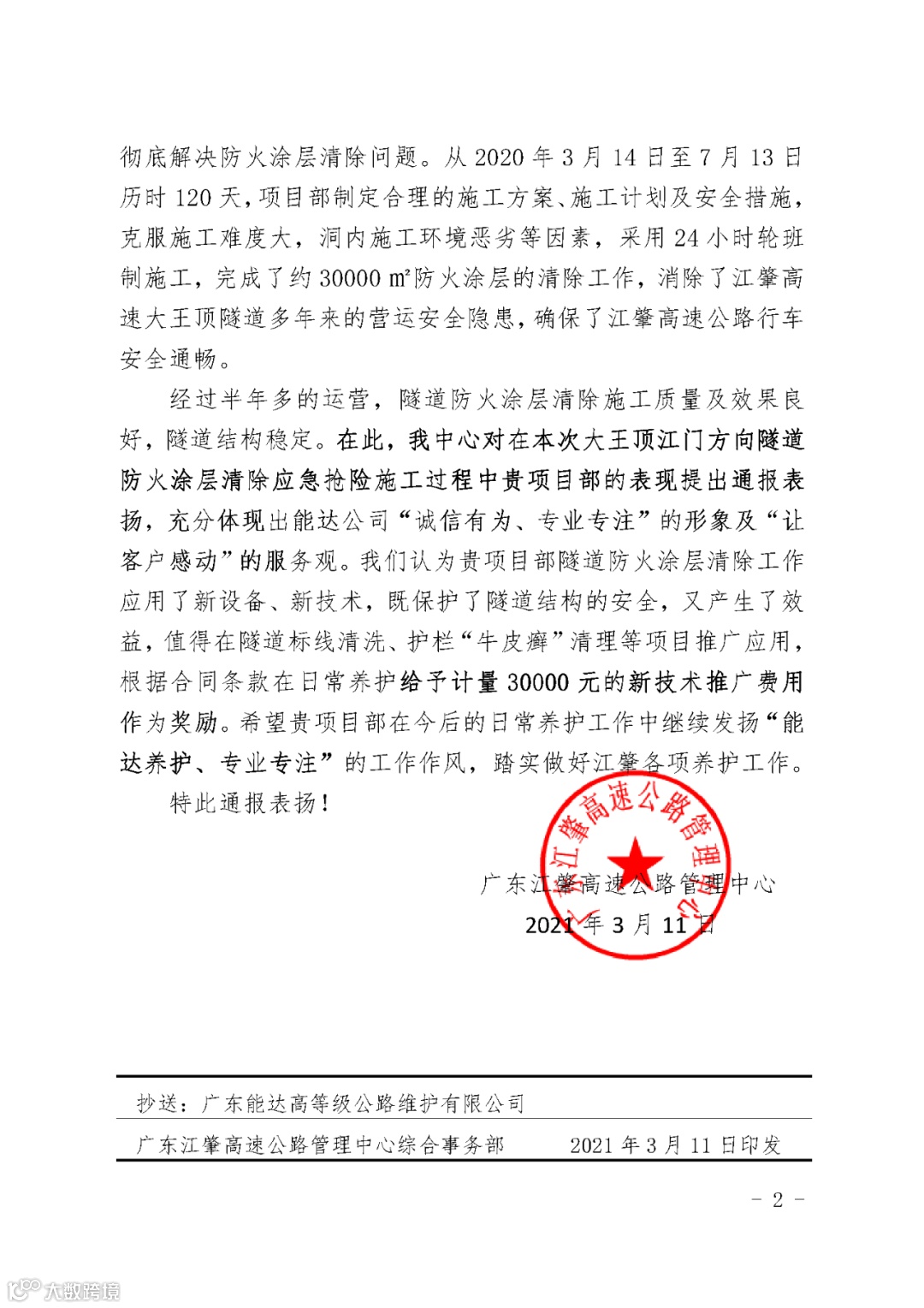 在表扬文件中,广东江肇高速公路管理中心对公司在江肇高速公路大王顶隧道(江门方向)防火涂层清除应急抢险施工过程中“克服困难、注重实效、敢于创新”的表现提出表扬,充分肯定了公司在施工过程中体现的“诚信有为、专业专注”的形象以及“让客户感动”的服务观。